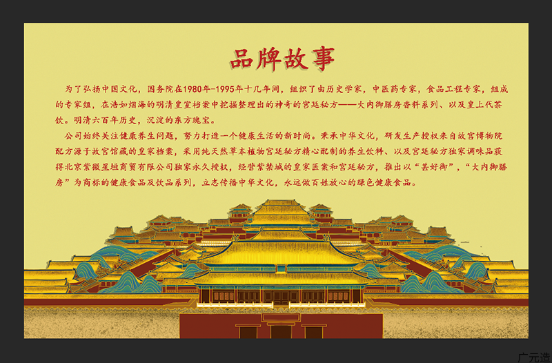 为了更好的传承中华瑰宝,使宫廷秘方“飞入寻常百姓家”,广元市甚好御食品饮料有限公司得到了北京紫薇星垣公司经营皇家医药档案及宫廷秘方的授权,开发出了“甚好御”和“大内御膳房”两个品牌,致力于为广大消费者提供高品质的健康饮食产品。