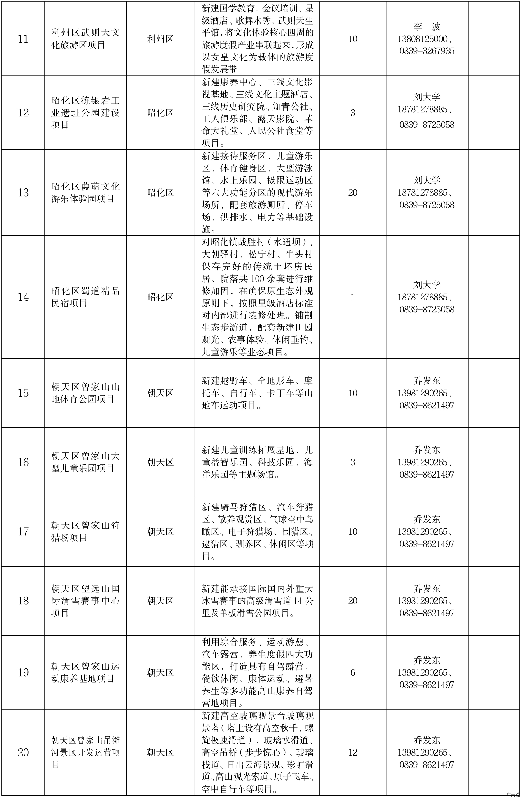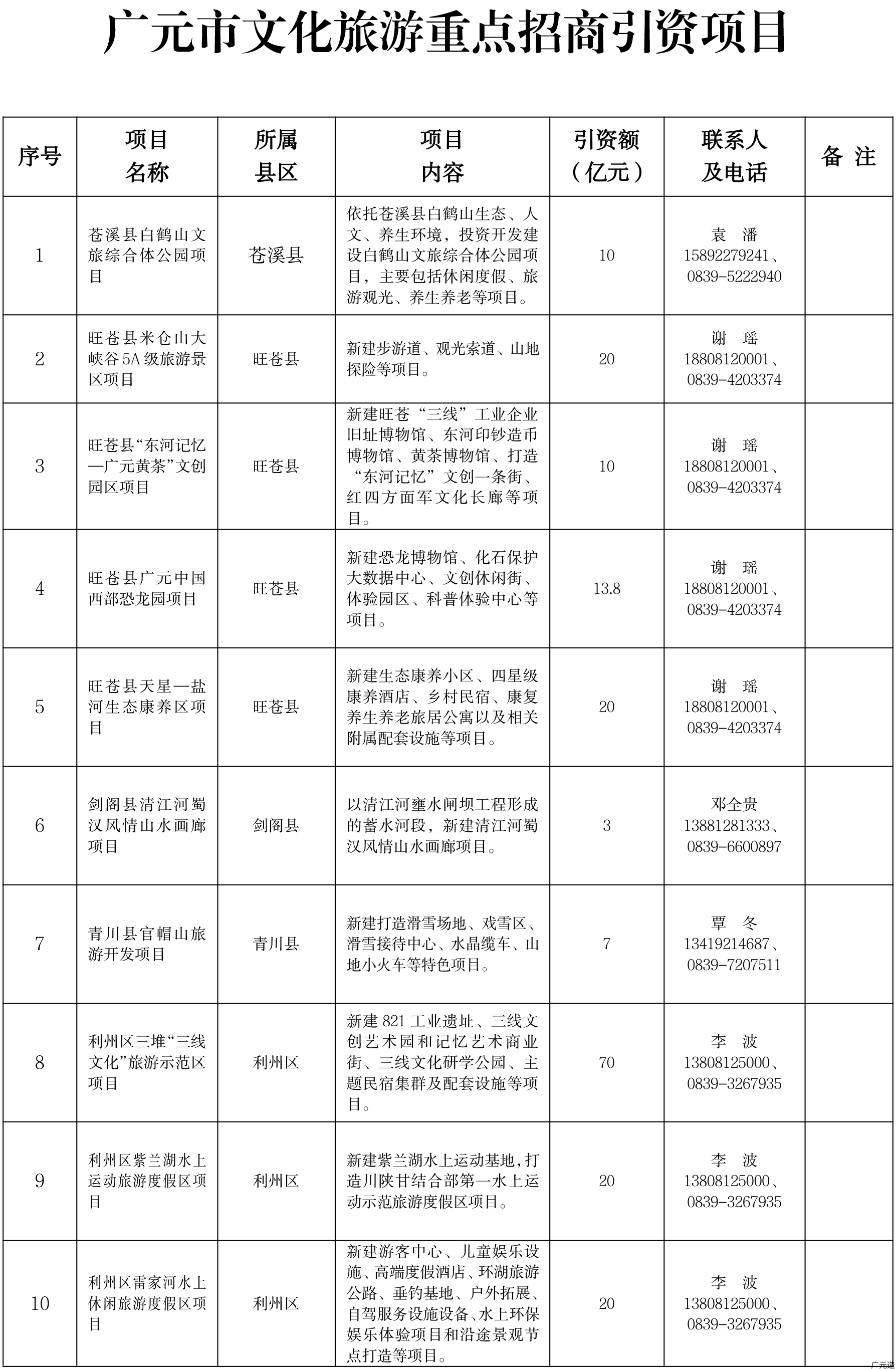 广元市文化旅游重点招商引资项目