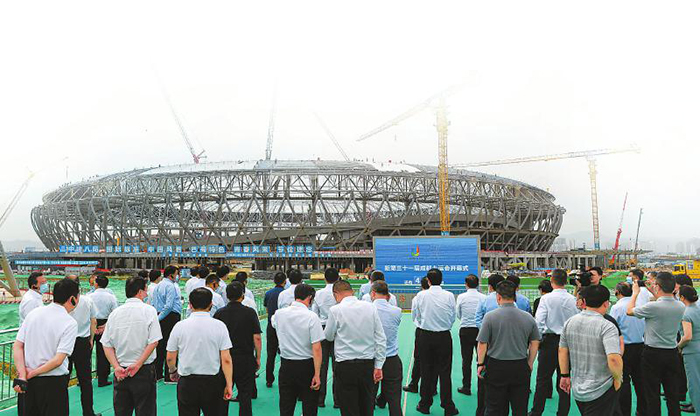 6月3日,与会者考察成都大运会体育中心主会场场馆项目建设。