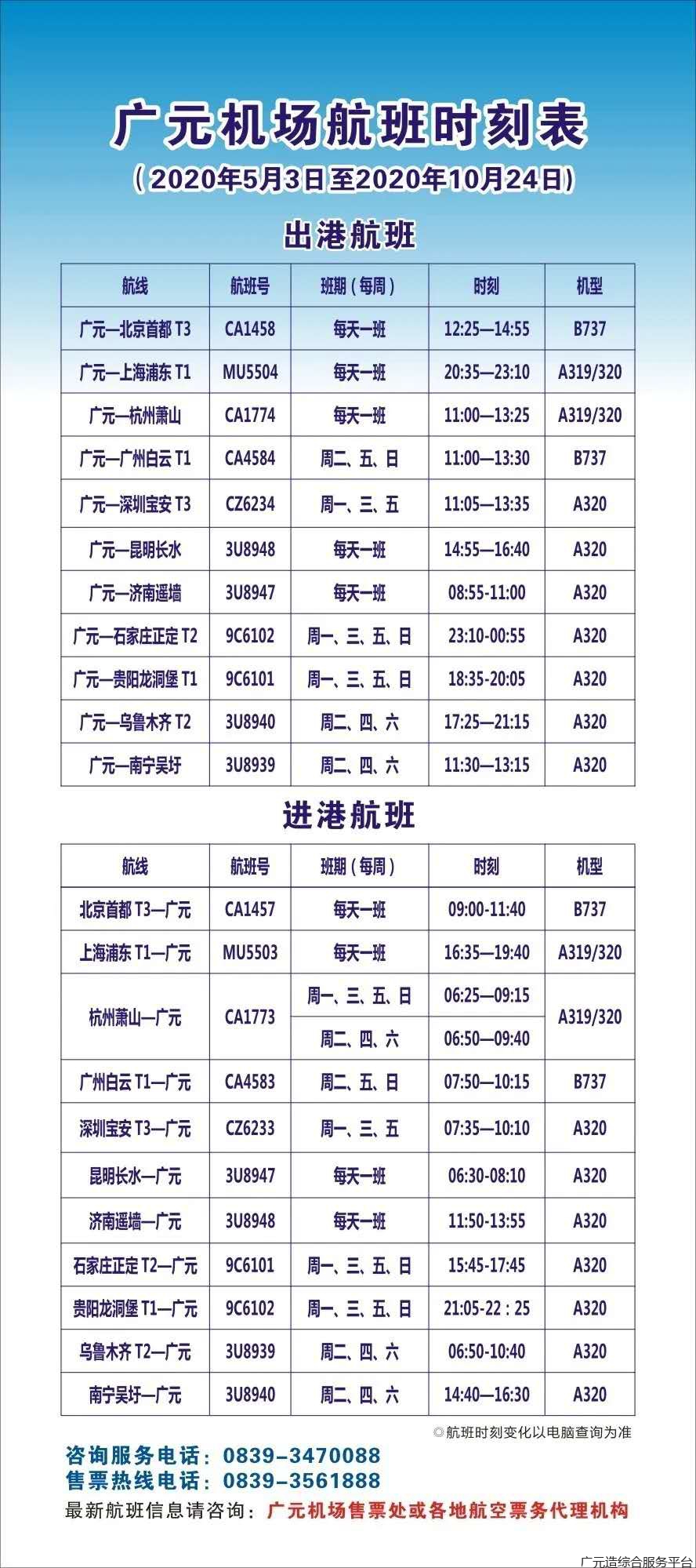 广元-广州CA4584,调整为每周二、五、日 11:00—13:30;广元-深圳CZ6234,调整为每周一、三、五 11:05—13:35;广元—石家庄9C6102调整为每周一、三、五、日 23:10—00:55;广元—贵阳9C6101调整为每周一、三、五、日 18:35—20:05;广元—杭州CA1774时刻调整为 11:00—13:30。