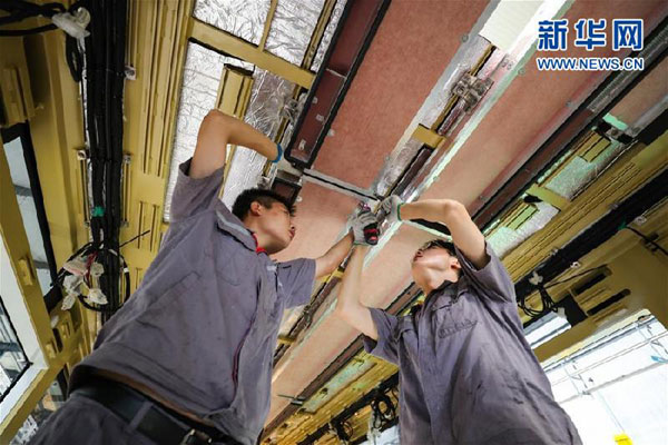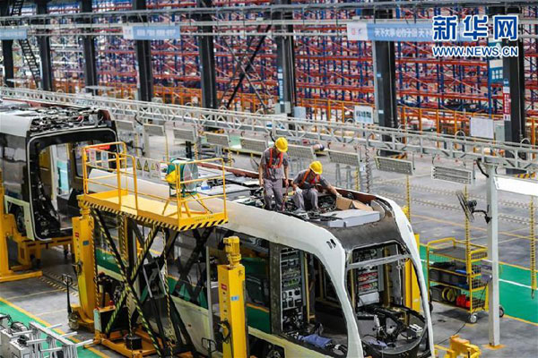 8月26日,在四川省宜宾市三江新区四川中车铁投轨道交通产业基地生产车间,工人正忙着生产安装智轨列车。