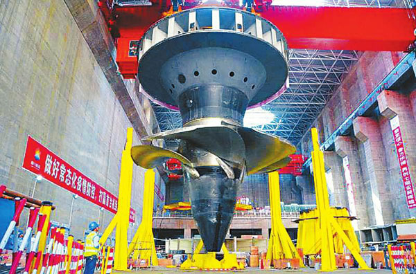 金沙水电站轴流转桨式水轮机转轮进行吊装。