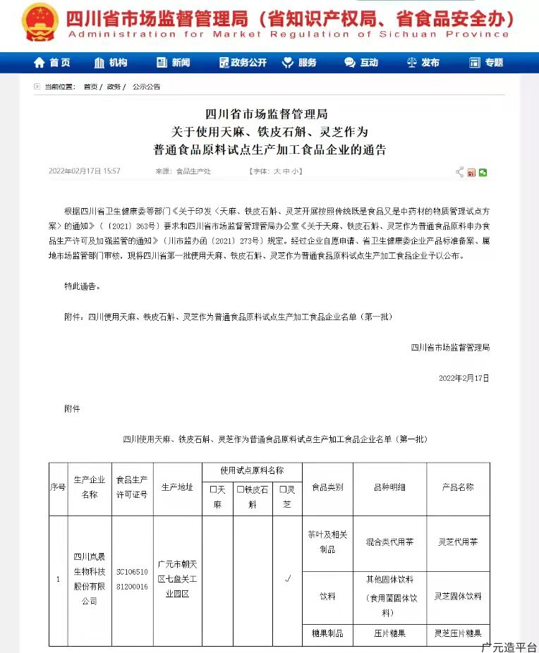 2月17日,四川省市场监管局发布通告,我市岚晟生物科技股份有限公司成为全省第一家使用天麻、铁皮石斛、灵芝作为普通食品原料试点生产加工食品企业。