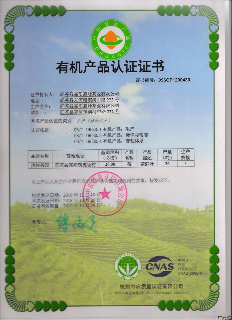 公司秉承着“绿韵佳饮,健康环保”的生产理念,建有机茶园1500余亩,拥有管理规范、设备先进的茶叶标准化加工厂1座,年产量30余吨,产值1000余万元,并通过食品质量安全认证(SC认证)及有机认证,为“广元七绝”米仓山有机茶主要生产基地之一。