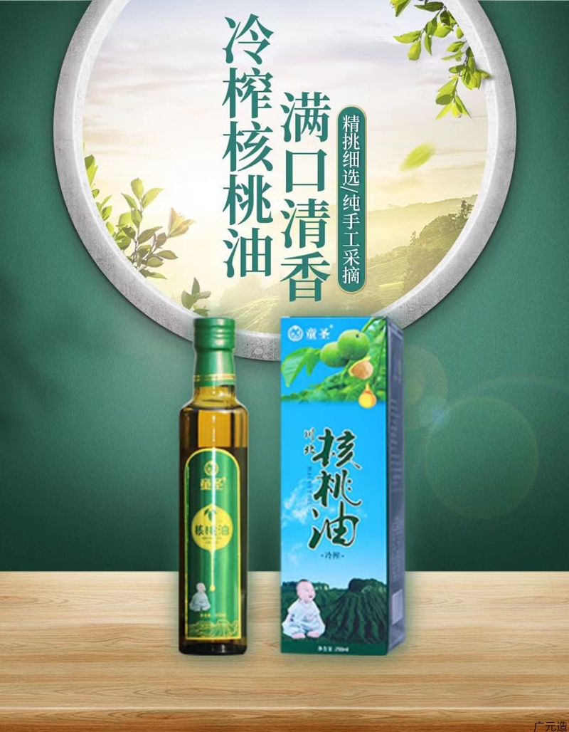 公司现有“童圣”核桃油品牌系列产品2款,即绿色童圣核桃油和有机童圣核桃油两类。童圣核桃油原料核桃来源于旺苍县的优质、绿色、有机核桃,采用先进压榨工艺冷榨而成,未经高温化学精炼,保有原生态营养成分,100%的纯核桃油,未添加任何防腐剂和抗氧化剂,年生产能力100吨。
