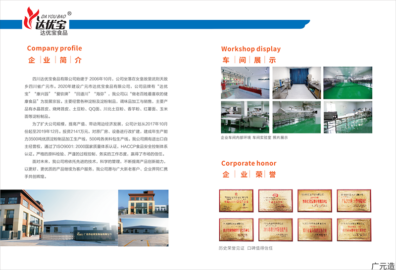 四川达优宝食品有限公司始建于2006年10月,公司坐落在女皇故里武则天故乡四川省广元市,2020年建设广元市达优宝食品有限公司。