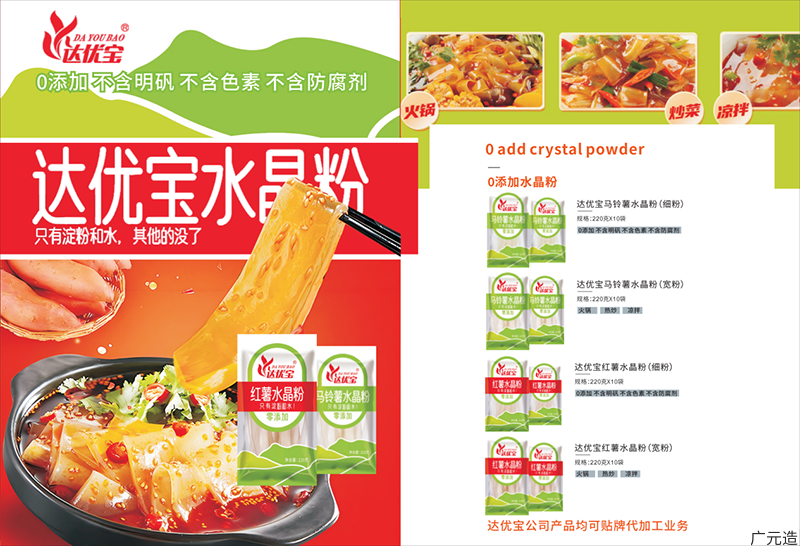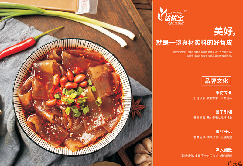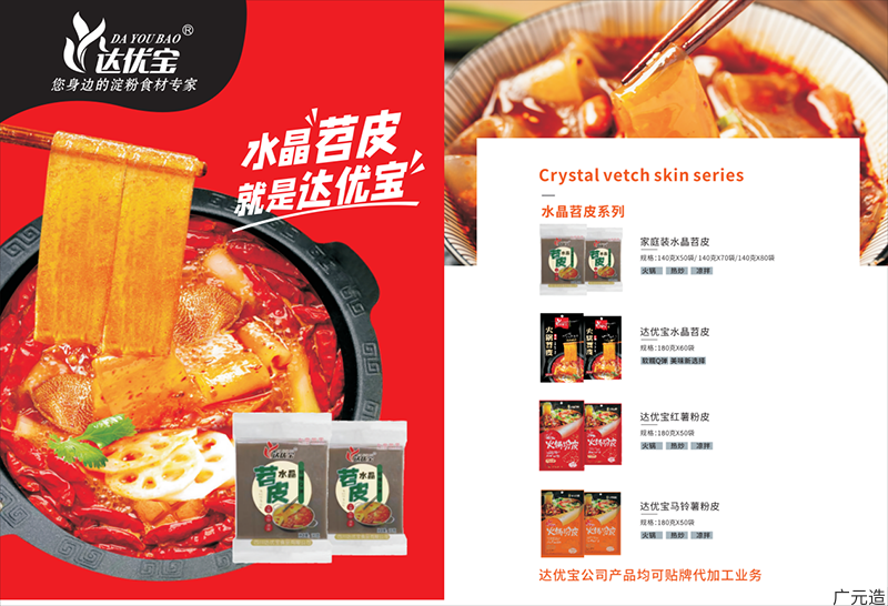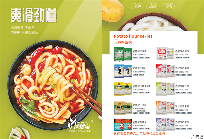 公司品牌有“达优宝”“康兴园”“爱钦牌”“回道川”“海弥”,我公司以“做老百姓最喜欢的健康食品”为发展宗旨。主要经营各种淀粉及淀粉制品,调味品加工与销售,主要产品有水晶苕皮、烧烤苕皮、土豆粉、QQ面、川北土豆粉、香芋粉、红薯面、玉米面等淀粉制品。