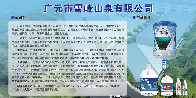 广元市雪峰山泉有限公司创建于1999年,是一家包装饮用水和瓶装饮用水生产、销售企业;生产基地位于嘉陵江上游生态屏障黑石坡万亩国家森林公园腹地,水资源丰富、质地优美洁净;公司实力雄厚、规模宏大,属广元市规模企业,居行业翘楚。