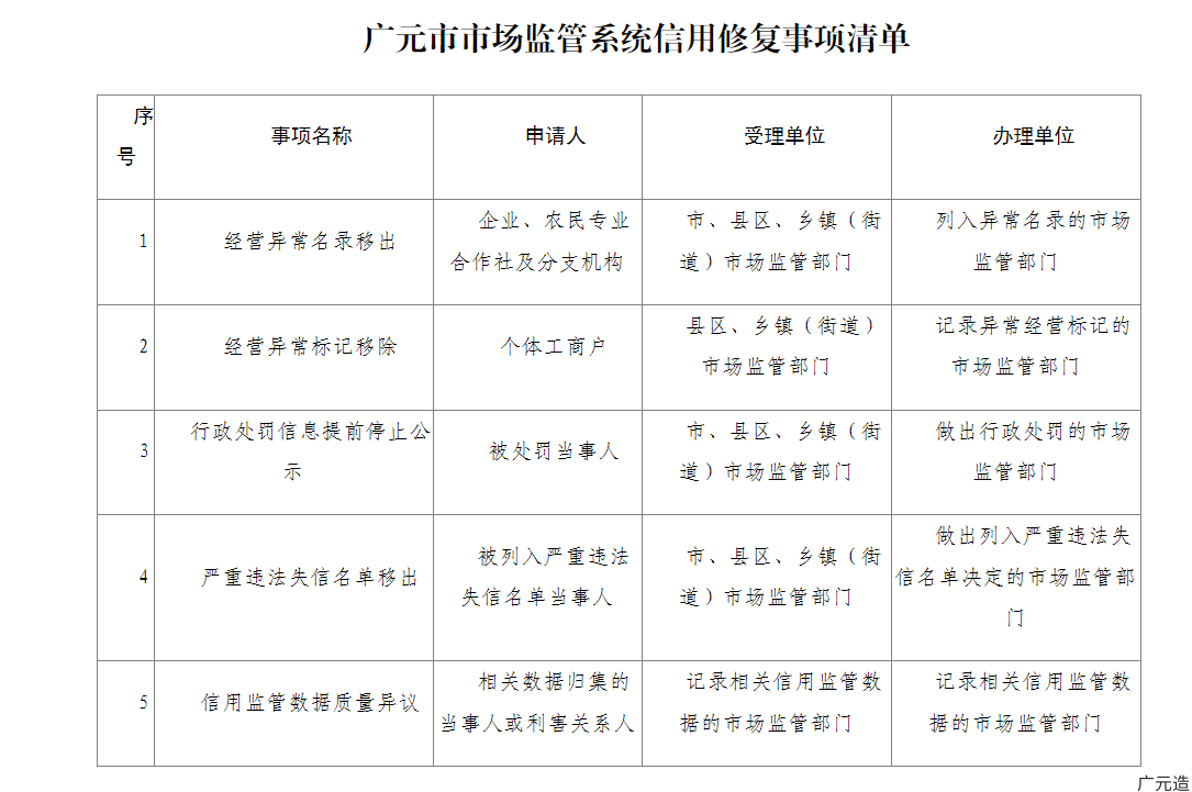 3.全面落实跨部门信用修复机制。各级市场监管部门要按照《广元市市场监管领域企业行政处罚公示信息信用修复跨部门“一次办”和跨区域“当地办”工作方案》(广市监发〔2023〕27号)关于跨部门“一次办”的要求,对于线下受理的行政处罚公示信息信用修复要一并办理“信用中国(四川广元)”的对应信用修复,并通知申请人。