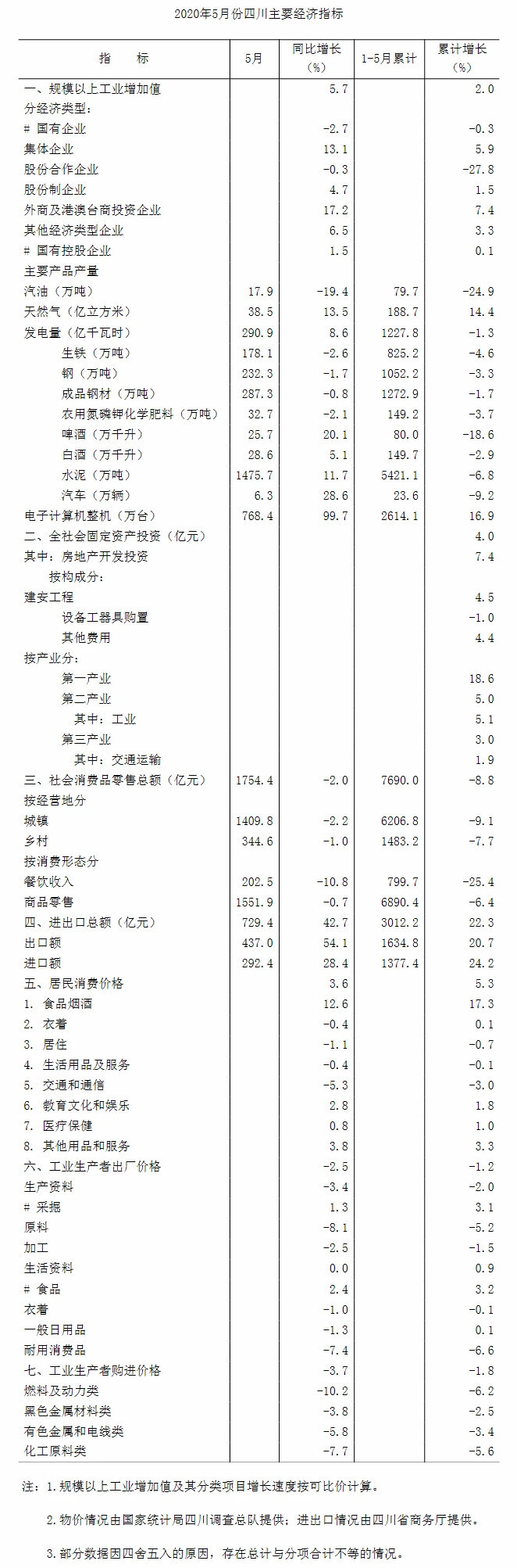 6月16日,四川省统计局发布今年前5月全省国民经济主要指标数据,全省经济恢复回升态势更加明显。工业、投资增势良好。1-5月,全省规模以上工业增加值同比增长2%,全省全社会固定资产投资同比增长4%,分别比1-4月回升1个百分点和2.7个百分点。消费尽管仍然处于下降态势,但降幅明显收窄。1—5月,全省实现社会消费品零售总额7690亿元,同比下