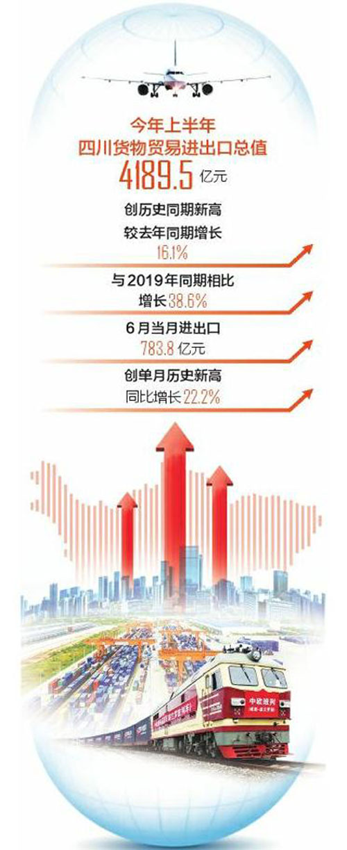 “去年全年,四川进出口规模首次突破8000亿元大关,创下8081.9亿元人民币的历史最高纪录,增速列全国第二。今年上半年增长势头依然保持强劲,再创历史新高。”成都海关统计分析处处长潘旭东表示,即便是与未受疫情影响的2019年同期相比,上半年四川外贸依旧实现了38.6%的较快增长,稳增长态势进一步巩固。