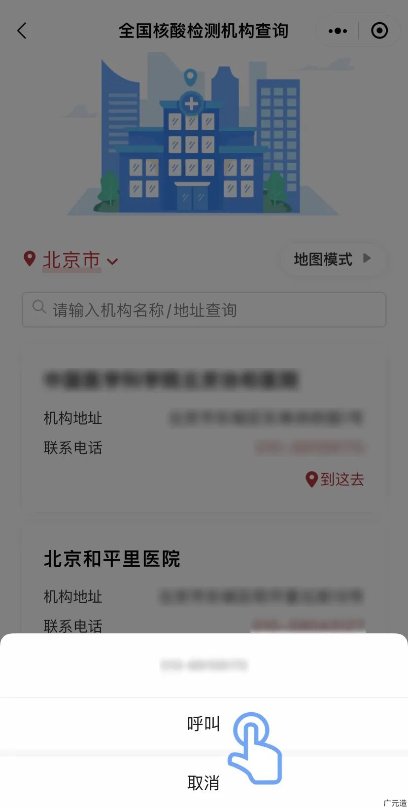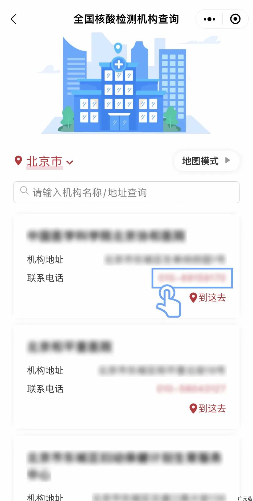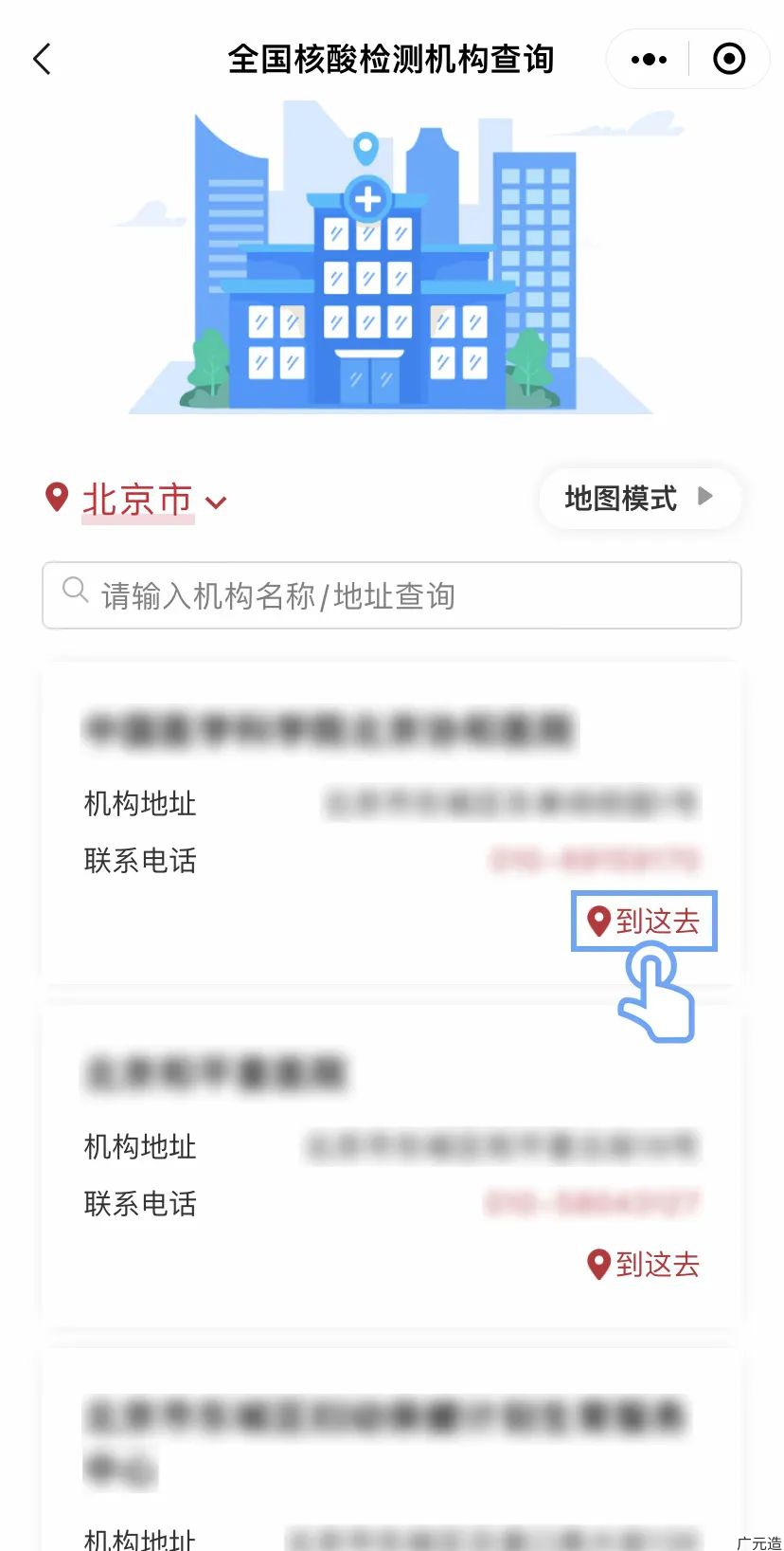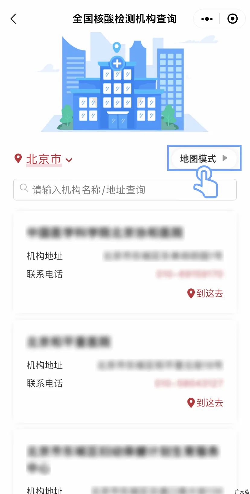 查询机构:进入服务后,选择所在省份及城市,或输入机构名称或地址等关键字,即可显示该区域的核酸检测机构地址及联系电话。通过切换“地图模式”可进入“核酸检测点查询地图”进行查看。