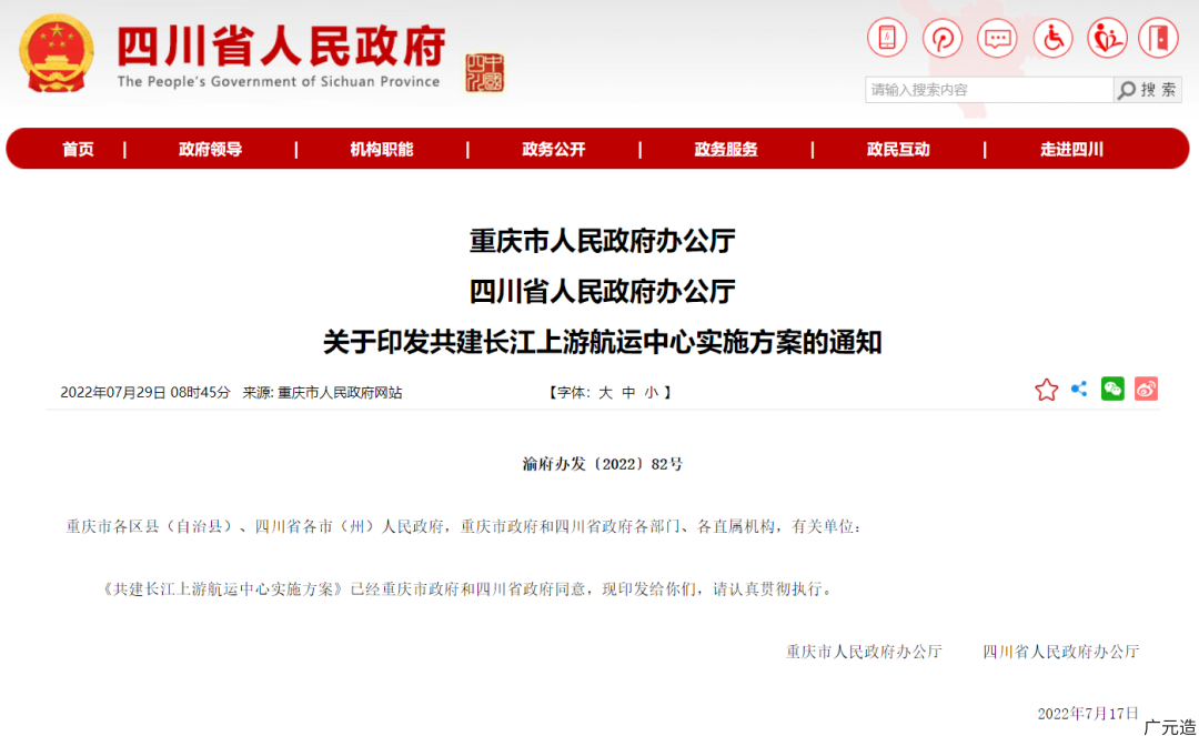 7月28日,重庆市人民政府办公厅、四川省人民政府办公厅印发了《共建长江上游航运中心实施方案》(以下简称《方案》),其中提到:力争到2025年,基本建成航运产业要素聚集、航运服务功能健全、航运市场繁荣规范、具有国际和区域航运资源配置能力的长江上游航运中心,成为“一带一路”、长江经济带、西部陆海新通道联动发展的战略性枢纽。