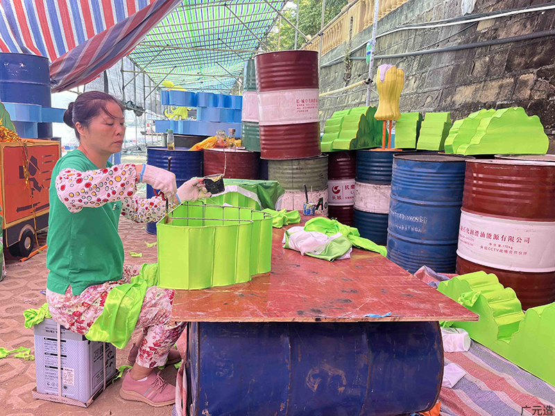 “整个制作流程大致分为设计、出图、放样、焊接、裱糊、上色六个步骤,彩船各部位制作同时进行,现小配件已全部完成,正在搭建主体框架。”广元市演艺有限责任公司彩船制作现场负责人蔡宇梅介绍,所有工作完成后,还需进行整体美化,彩船制作才算完成,最后经过安全检测方可由牵引船舶将其运抵展览现场进行彩排。