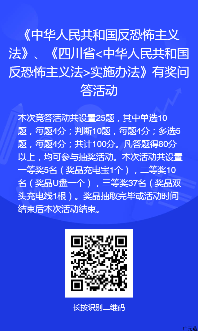 为全面提高社会公众反恐怖斗争意识,增强应对暴恐袭击整体能力,大力推动反恐怖工作法治化、常态化。广元市反恐怖工作领导小组办公室决定于国庆期间开展“平安共创、反恐有我”网络有奖竞答活动。