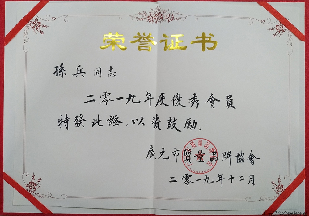 我公司总经理孙兵同志获广元市质量品牌协会2019年优秀会员称号