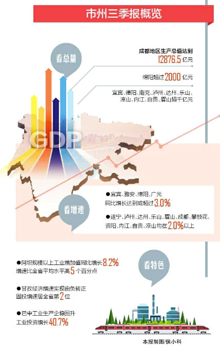 从增速看,宜宾、雅安、绵阳、广元4市增速“破3”,宜宾达到3.3%;上半年一度负增长的4个市州也全面扭转下滑势头,前三季度增速全部转正。